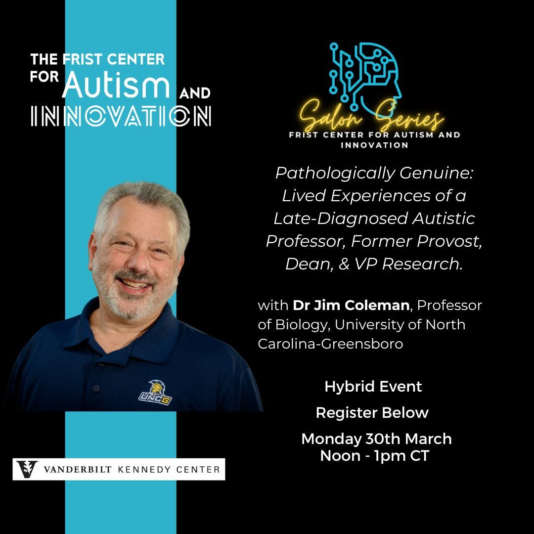 “Pathologically Genuine: Lived Experiences of a Late-Diagnosed Autistic Professor, Former Provost, Dean, & VP Research” with Dr. Jim Coleman Professor of Biology at UNC-Greensboro.